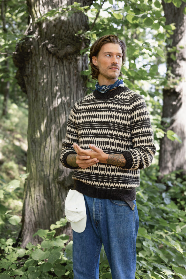 Kleiva sviiter meestele on kootud Tynn Peer Gyntist. Muster on inglise keelne.