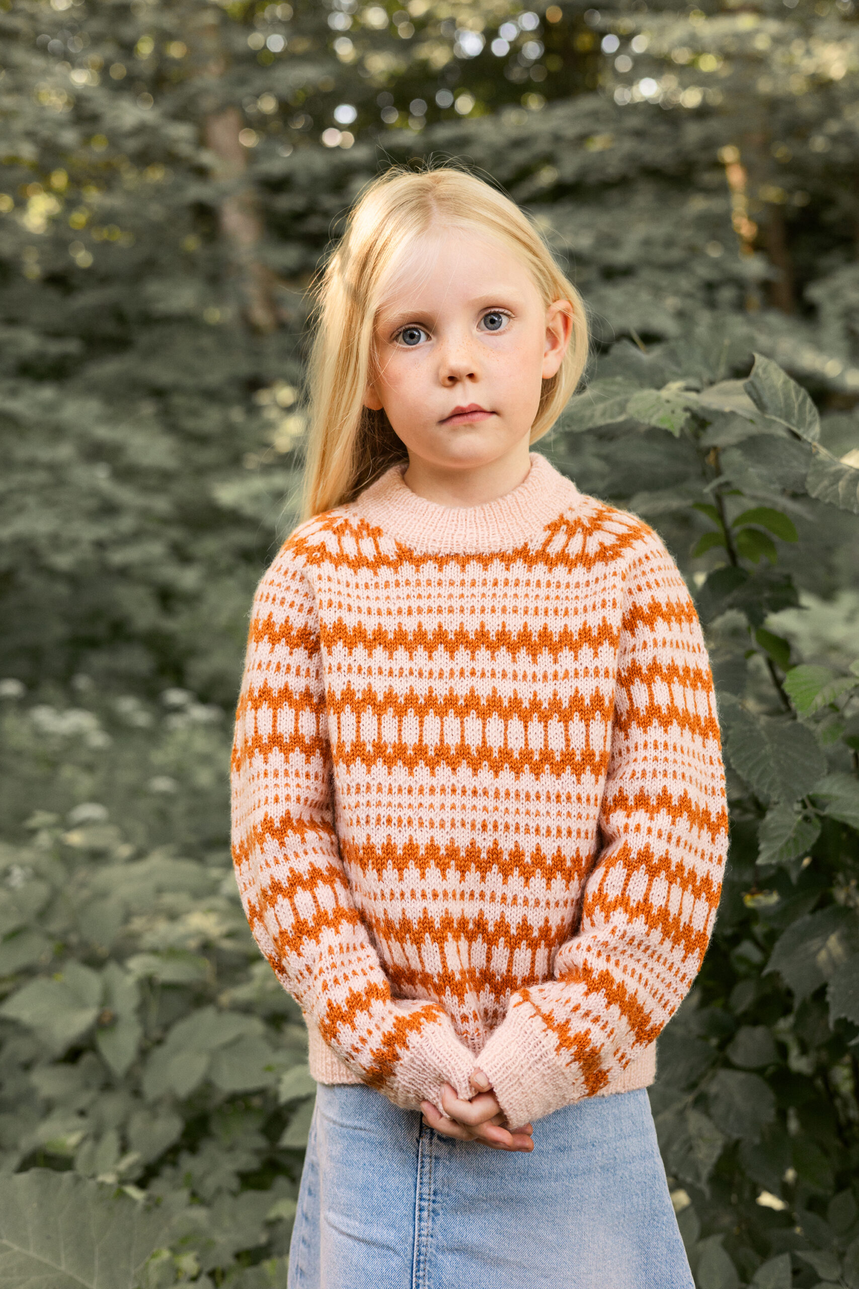 Tynn Peer Gyntist ja Mini Alpakkast ülevalt alla kootud mustriline sviiter lastele. Muster on inglise keeles.